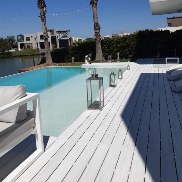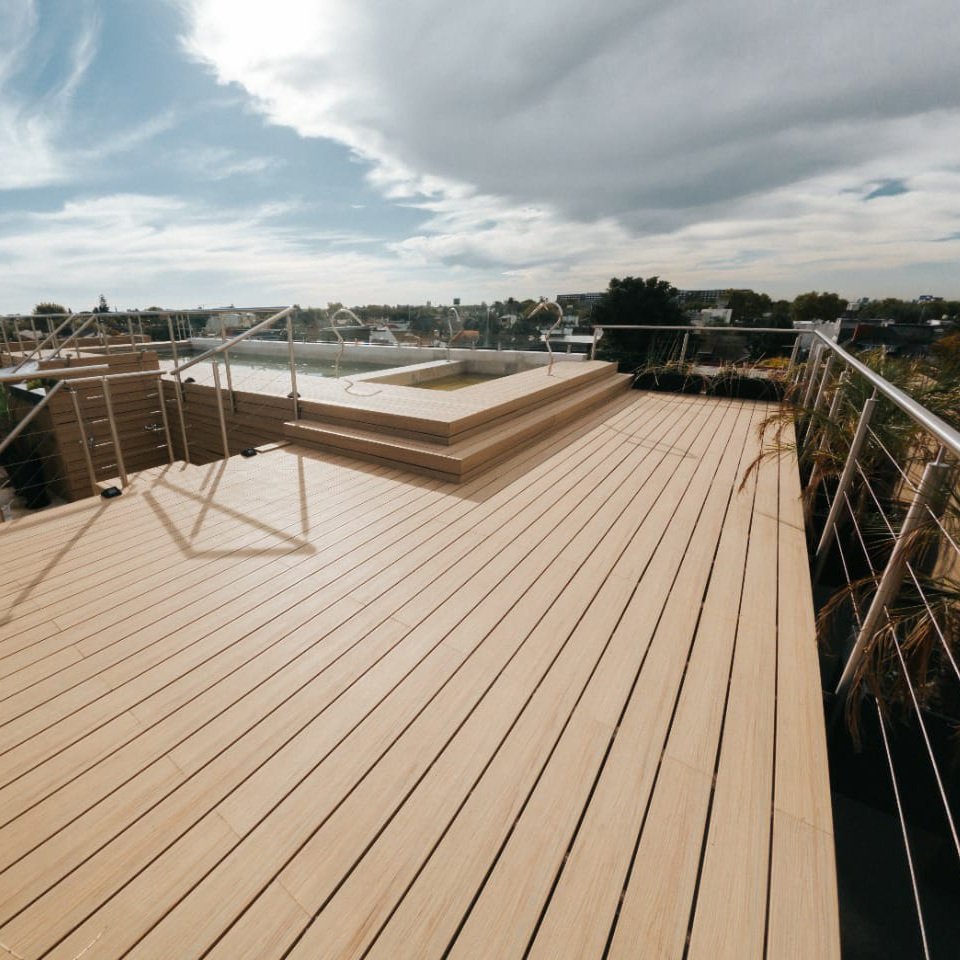 Son tablas 100% macizas de WPC (Wood Plastic Composite) de 4ta Generación. Esto es un compuesto de madera y plástico, con una cobertura de 360° que los hace ultra resistente a condiciones de exterior. Tienen textura y aspecto similar a la madera, pero mejores prestaciones, mayor durabilidad y no requieren mantenimiento.
